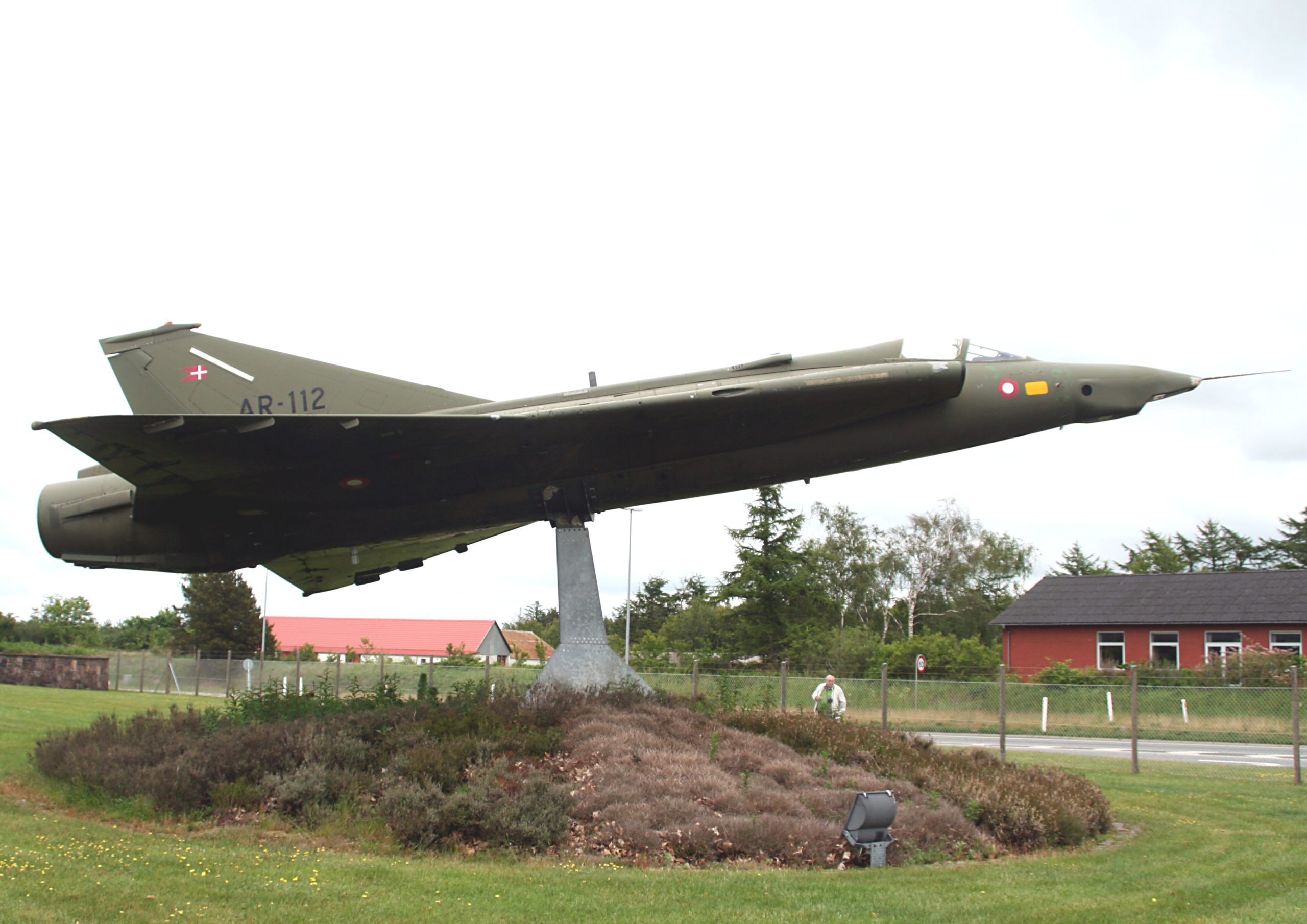 En dansk Draken som prydnadsflygplan utanför sin gamla bas. Foto Peter Langsdale