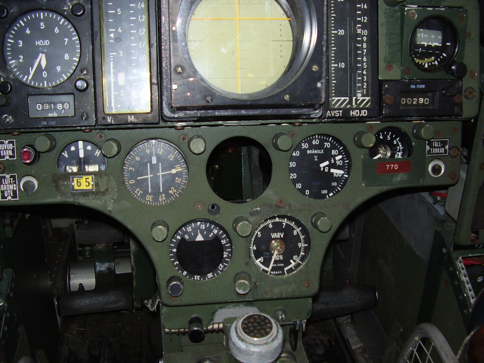 Bild som visar instrumenten som presenterade informationen från stridsledningen för piloten. De är de två rektangulära boxarna på var sida om den runda radarskärmen.