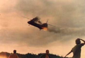 En CH46 Sea Knight träffas av vietnamesisk luftvärnseld, den 15 juli 1966. Foto: Haas Faust