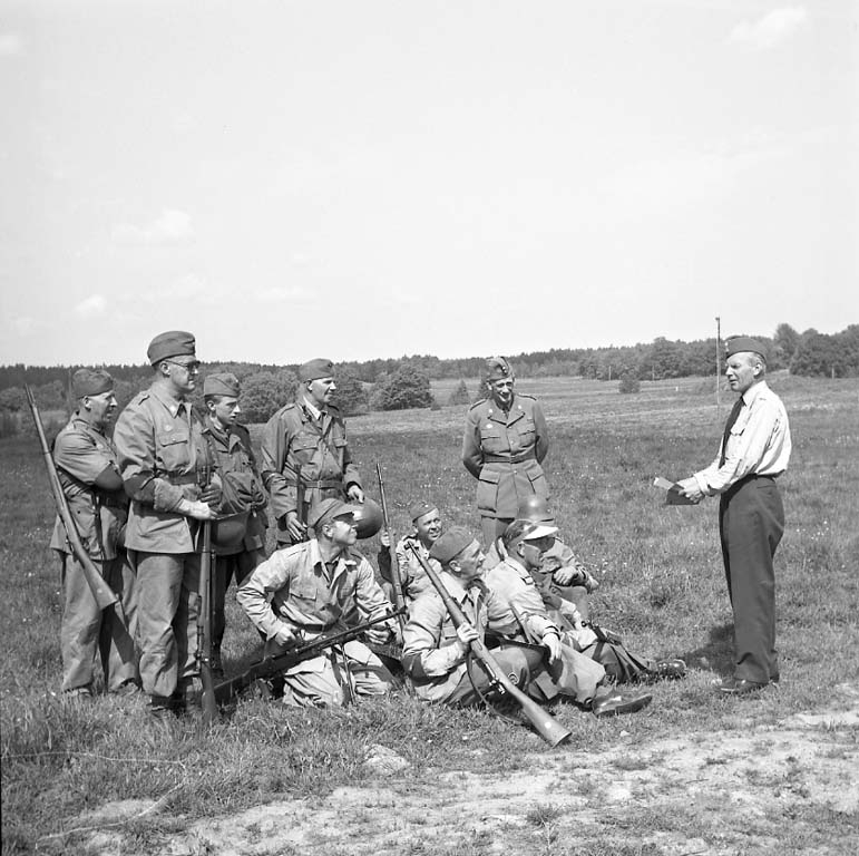 En grupp hemvärnssoldater i Bohuslän 1961. De har äldre uniformer och äldre vapen, framförallt Mausergevär m/96.